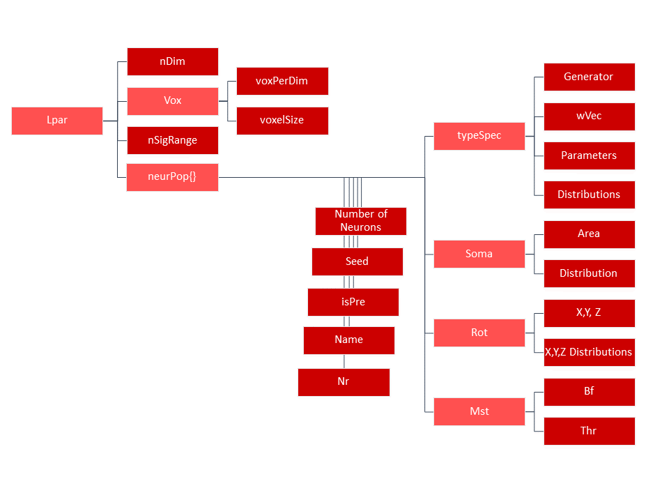 Lpar is the parameter structure that defines the cell populations from which axonal and dendritic densities are generated. The figure below shows the structure of lpar. Any field with a lighter color is itself a struct.